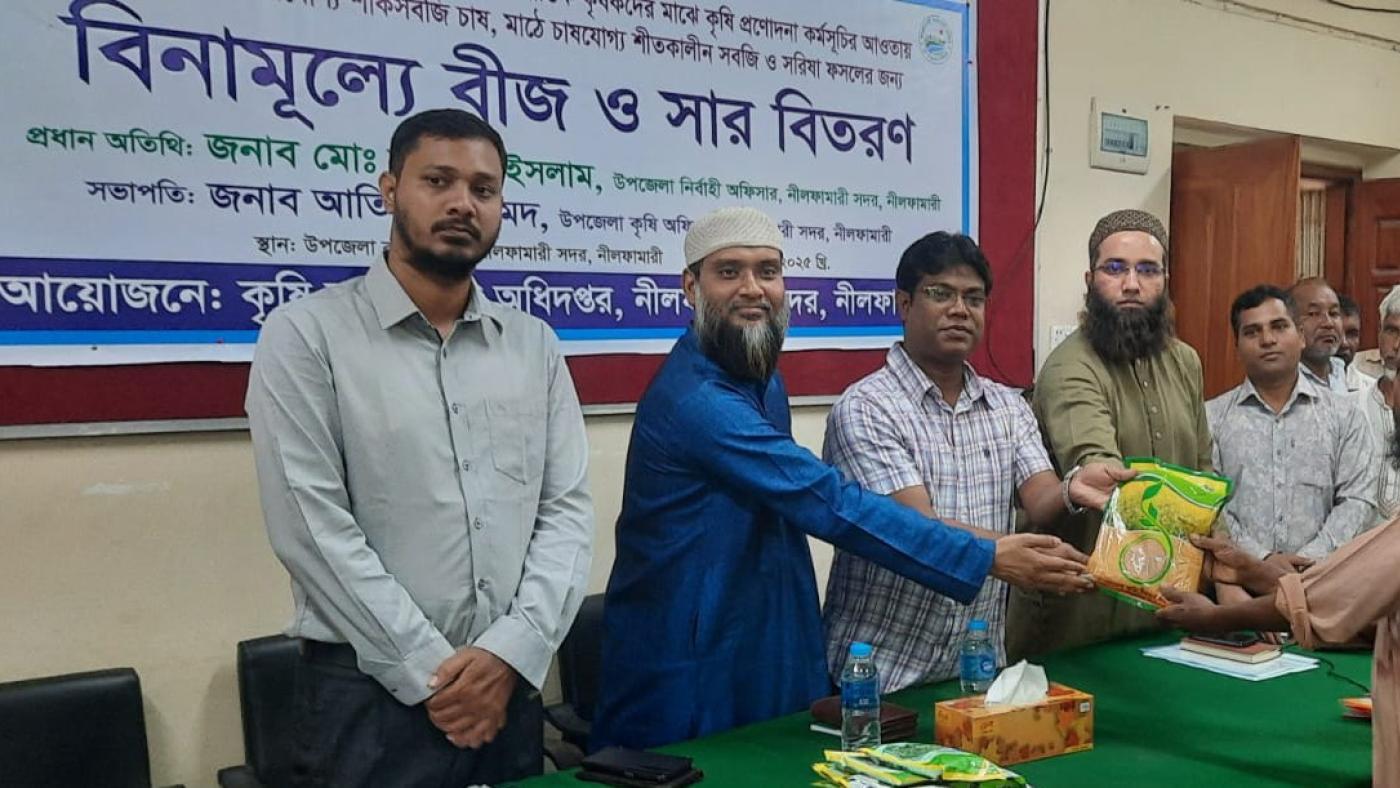 নীলফামারীতে চলতি অর্থবছরে রবি মৌসুমে ক্ষুদ্র ও প্রান্তিক কৃষকদের মাঝে কৃষি প্রণোদনা কর্মসূচীর আওতায় বসতবাড়িতে চাষযোগ্য শাকসবজি চাষ, মাঠে চাষযোগ্য শীতকালীন সবজি ও সরিষা ফসলের জন্য মঙ্গলবার(২১ অক্টোবর) দুপুরে বিনামূল্যে বীজ ও সার বিতরণ করা হয়েছে।